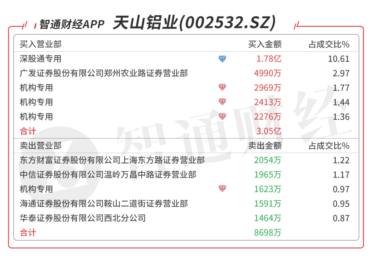 天山铝业(002532.SZ):受到众多机构青睐,今日共4家机构席位出现在龙虎榜单上,合计净买入6035万元,深股通买入1.65亿元,当日净买入2.09亿元,该股底部放量首板,预计压力位在年线附近。