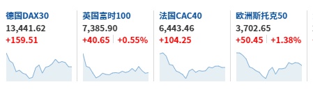 2. 截至发稿,德国DAX指数涨1.18%,英国富时100指数涨0.55%,法国CAC40指数涨1.64%,欧洲斯托克50指数涨1.38%。