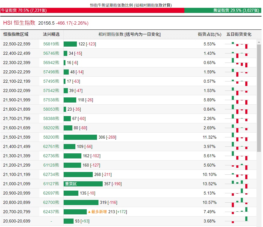 法兴恒指牛熊证街货分布图中的数据显示,熊证街货重货区在21000-21099区间,该区间最新熊证数量为357张,较上一交易日减少190张;最多新增在20700-20799区间,该区间最新熊证数量为213张,较上一交易日增加172张。