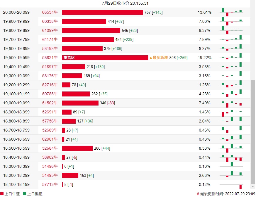 牛证街货重货区在19500-19599区间,该区间最新牛证数量为806张,较上一交易日增加259张;最多新增在同一区间。