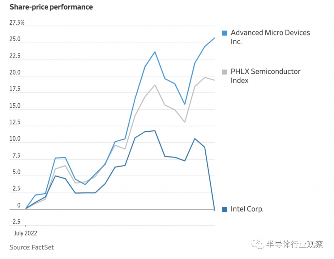 智通财经APP获悉,据华尔街日报报道,英特尔(INTC.US)因第二季度业绩不佳而股价下滑,这使得这家美国标志性半导体公司的市场估值落后于常年追赶的 Advanced Micro Devices(AMD.US)。英特尔股价在周五交易中暴跌逾 10%,此前该公司公布第二季度意外亏损,下调全年销售预期,并表示在为蓬勃发展的数据中心市场推出一款关键新芯片时遭遇挫折。