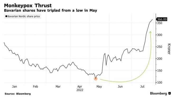 可以看到,在各国政府开始订购Bavarian Nordic的猴痘疫苗后,这家公司的股价已从5月份的低点上涨了两倍多。目前,该公司生产的猴痘疫苗是唯一一种被批准用于预防猴痘感染的疫苗,需求激增后,该公司今年已多次上调其营收指引。