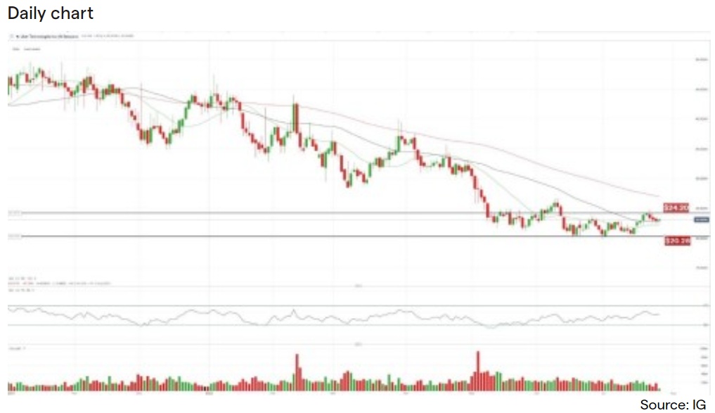 从日线图上看,优步股价近期似乎未能突破24.20美元的关键阻力位,而20日简单移动平均线(SMA)的支撑位现在成为了关键点位。