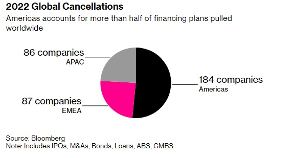 这些交易包括IPO、债券、贷款和收购,其价值总额超过2540亿美元。在全球范围内,美洲推迟或搁置的交易数量最多,达到184笔,是其他地区的两倍多。