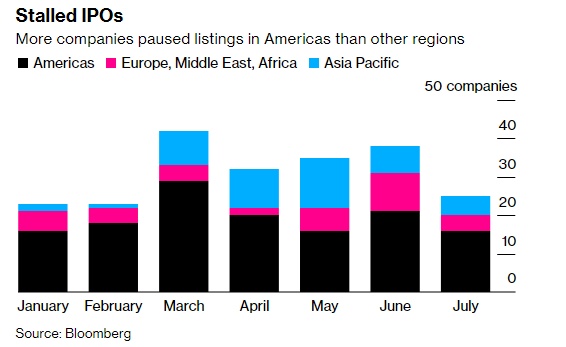 美洲数值最高的原因是其股票市场放缓。自1月以来,该市场有136宗IPO被撤回,占今年全球搁置上市总数的三分之二。