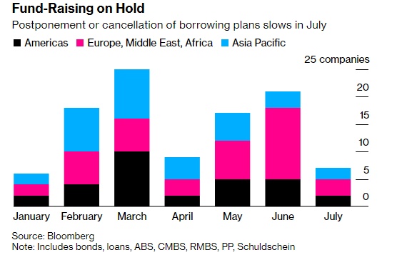 在债券市场,借款人仍面临筹集资金的挑战。自今年年初以来,全球共有103笔债券交易被推迟或取消,价值至少640亿美元。由于欧洲出现了能源危机,7月的第一笔德国债务凭证贷款交易也被推迟。