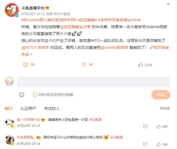 随着节目内容的不断推进,带看主播的个人分享和弹幕的同步讨论也让更多一知半解的观众们,真实了解了电子竞技的全貌。Gemini本人更是因其在节目中与队中选手真实情感的流露,让更多人看到了电子竞技中鲜为人知的温情一幕。节目播出后,#周柯宇哭着感谢Gemini#、#给Gemini刷火箭的是周柯宇吧#等相关话题均登上了微博热搜。