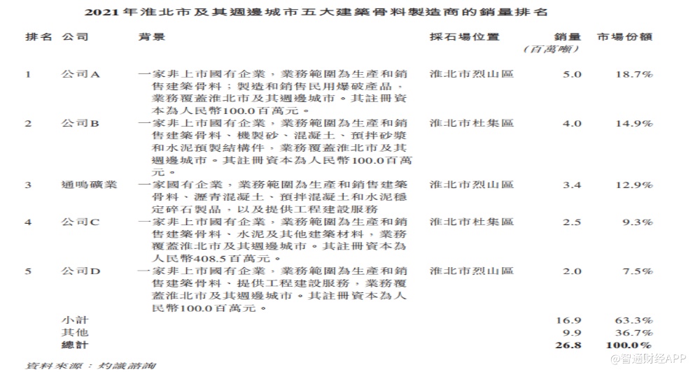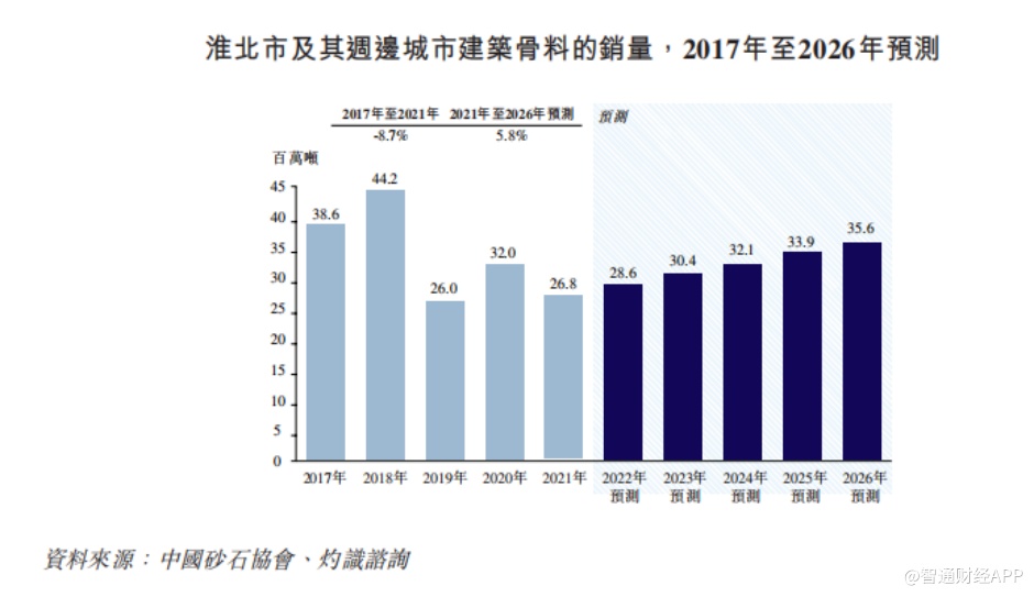 灼识咨询报告显示,淮北市及其周边城市建筑骨料市场规模先是由2017年的约3860万吨增长至2018年的约4420万吨,并于2019年减少至约2600万吨,后于2020年回弹至约3200万吨及最终于2021年减少至约2680万吨,2017年至2021年的复合年增长率约为负8.7%。