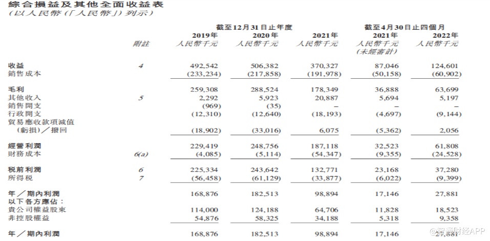 在这样的市场背景下,淮北绿金的业绩主要建立在市场需求之上。截至2021年12月31日止三个年度及截至2022年4月30日止四个月,公司的收益分别约为4.93亿元(人民币,下同)、5.06亿元、3.7亿元及1.25亿元。同年/期利润分别约为1.69亿元、1.83亿元、0.99亿元及0.28亿元。