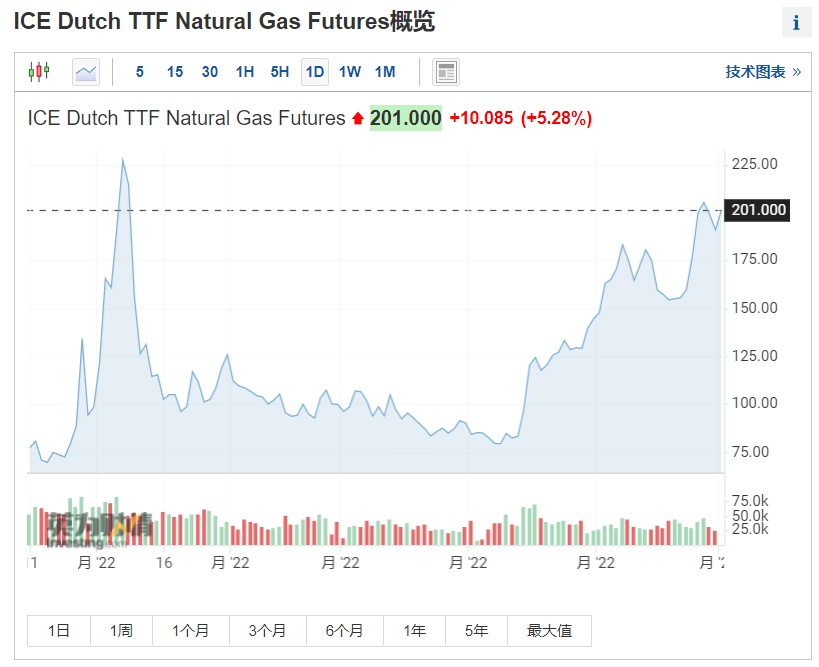 数据显示,俄气在7月的天然气日产量为7.74亿立方米,较6月份下降14%;俄气今年迄今为止的天然气产量为2624亿立方米,较上年同期下降12%。此外,俄气计划在2022年全年生产4944亿立方米天然气,较去年下降4%。截至发稿,基准TTF荷兰天然气期货价格涨超5%,至201欧元/兆瓦时。
