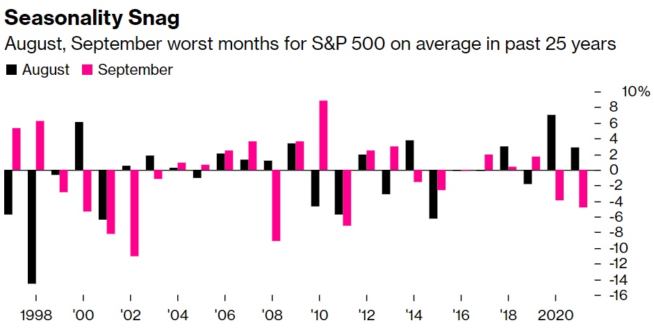 在投资者对7月份的美股飙升过于兴奋之前,有件事要记住:从历史上看,8月和9月是标普500指数一年中表现最差的两个月。