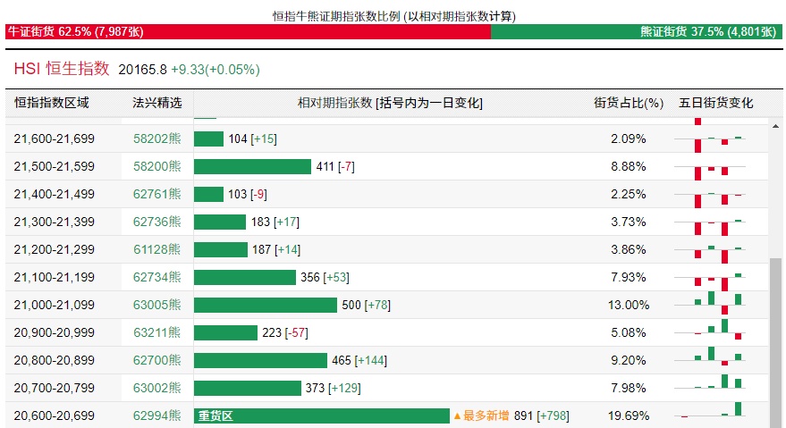 法兴恒指牛熊证街货分布图中的数据显示,熊证街货重货区在20600-20699区间,该区间最新熊证数量为891张,较上一交易日增加798张;最多新增在同一区间。
