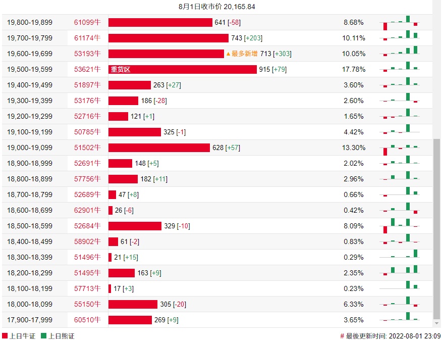 牛证街货重货区在19500-19599区间,该区间最新牛证数量为915张,较上一交易日增加79张;最多新增在19600-19699区间,该区间最新牛证数量为713张,较上一交易日增加303张。