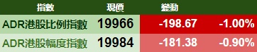 智通财经APP获悉,周一美股三大指数集体收跌,港股ADR指数下跌,按比例计算,收报19966点,较香港收市跌198.67点或1.00%。