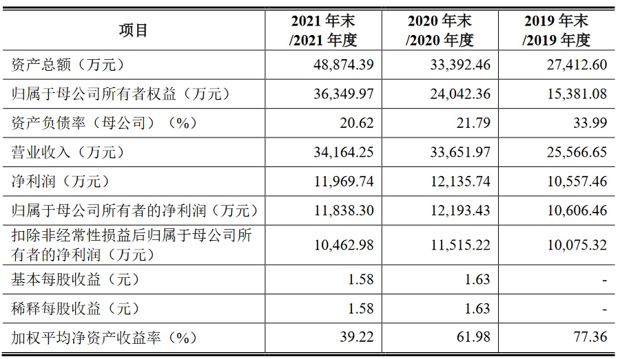 财务方面,于2019年、2020年及2021年,公司分别实现营业收入约人民币2.56亿元、3.37亿元和3.42亿元,净利润分别约为人民币1.06亿元、1.21亿元和1.2亿元。