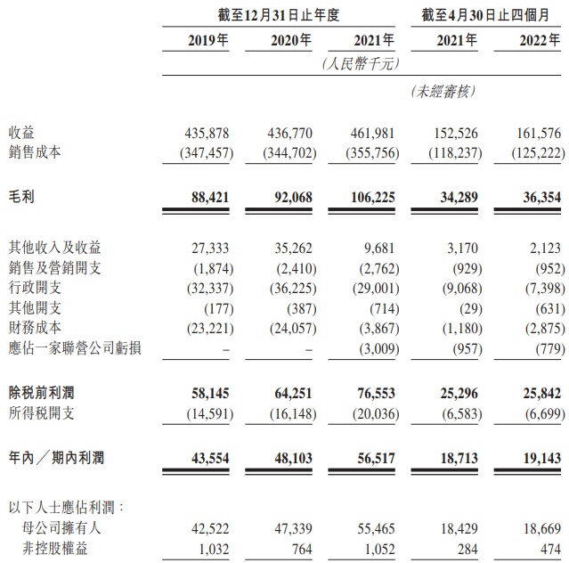 于2019年、2020年、2021年及2022年截至4月30日止四个月,苏新服务收益分别约为4.359亿元、4.368亿元、4.620亿元及1.616亿元人民币。同期,公司期内利润分别约为4355.4万元、4810.3万元、5651.7万元及1914.3万元人民币。