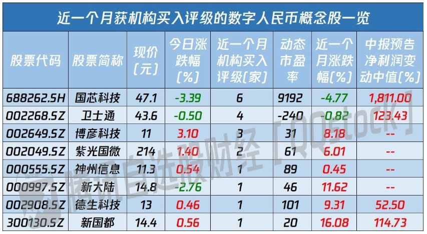概念股方面,腾讯自选股通过梳理发现,数字人民币概念股中,近一个月获得机构买入评级的有神州信息、新大陆等8家公司,其中国芯科技、卫士通较为领先,分别为6家、4家。