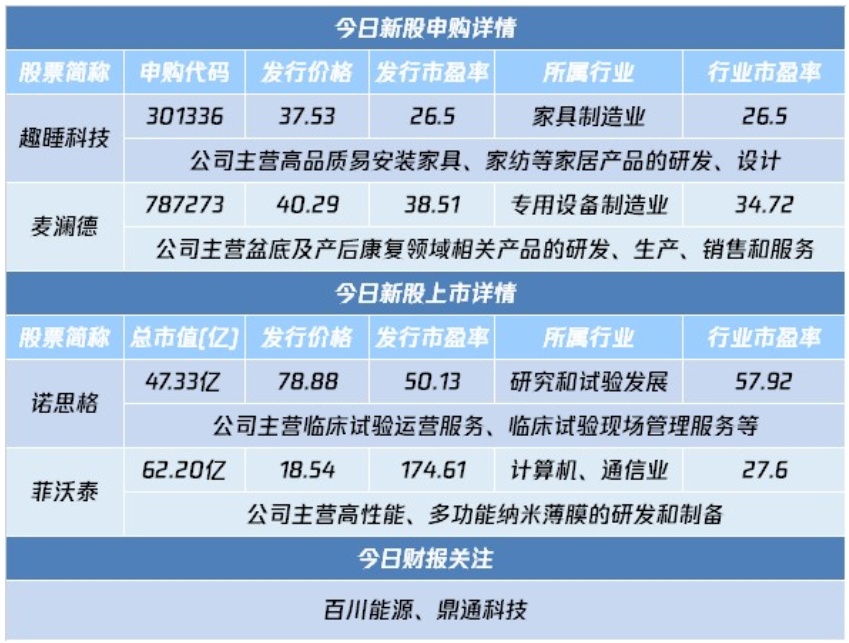 自选哥提示,今日趣睡科技、麦澜德2只新股申购;诺思格、菲沃泰2只新股上市。
