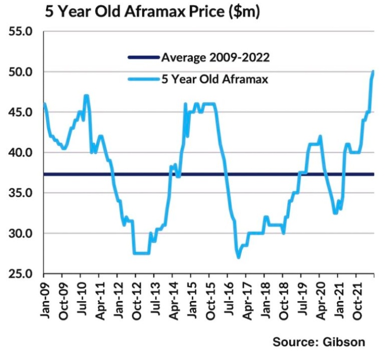Gibson表示,Aframaxes级油轮(指吨位在10-12万吨的原油轮)的价格涨幅更为可观,自2021年1月以来,5年的二手油轮价格上涨了50%,达到5100万美元,也超过了2021年初的新建油轮价格。