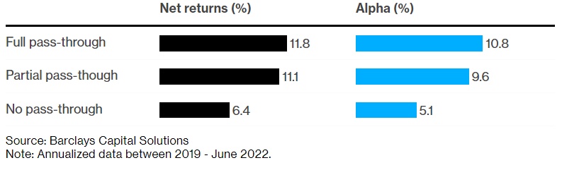 该研究发现,多经理基金在业绩最佳之列,全额收取过手费的基金公司“产生了卓越的净回报”。与部分收取或完全不收取过手费的对冲基金相比,这些高收费对冲基金也产生更高的超额回报。