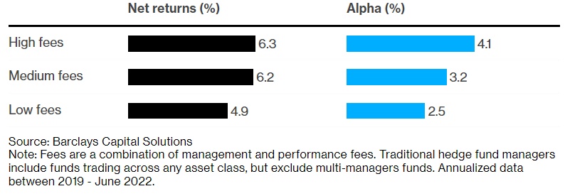 Solutions部门最近研究了大约290家对冲基金,包括大约40只多经理基金(平均管理70亿美元资产)、250只传统基金(平均管理20亿美元资产),对比他们的收费和最终回报,发现收费最高的对冲基金公司(通常也是业内最知名的大咖)长期而言回报率往往也高于收费低的竞争对手。
