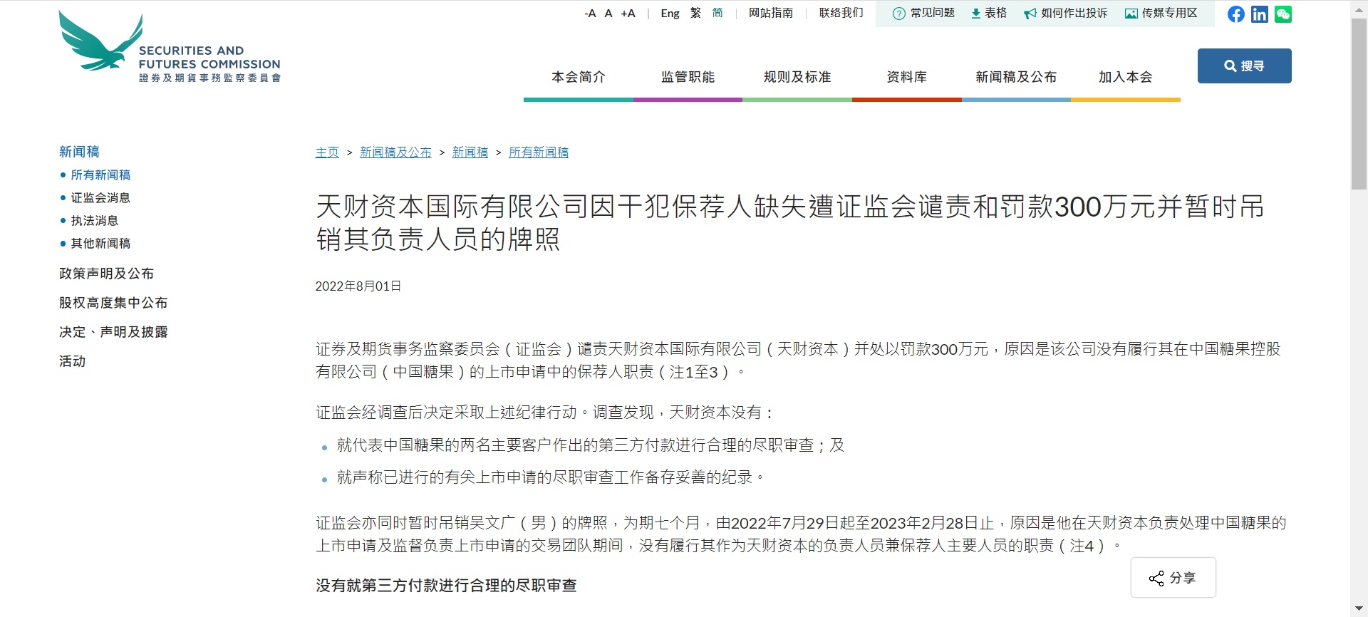 智通财经APP获悉,8月1日,香港证监会谴责天财资本没有在中国糖果(除牌前代码:08182)上市申请中履行保荐人职责,罚款300万港元,并且暂时吊销天财资本负责人员吴文广的牌照,为期7个月,至2023年2月底为止。吴文广在中国糖果上市申请中,作为天财资本保荐人主要人员。