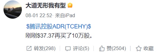 智通财经APP获悉,腾讯控股(00700)近日股价一路走低并跌破300港元,8月1日晚间,投资大佬段永平通过雪球账号“大道无形我有型”发布消息称:“刚刚37.37美元再买了10万股腾讯。”同时,段永平称自己对腾讯的投入不到1%,不算实质性投入,如果腾讯ADR跌至30美元以下,将会再多买一些。