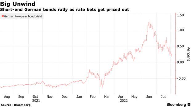 与此同时,对欧洲央行大幅加息预期的减弱也带动欧洲政府债券收益率下行。对欧洲央行加息最敏感之一的两年期德国国债收益率跌至0.17%,为5月16日以来最低水平。