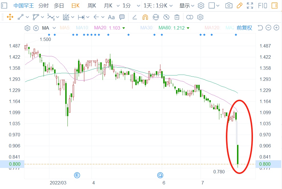 果然,随着盈警消息的正式披露,中国罕王的股价立马应声下跌——8月1日,该公司股价大幅低开,盘中一度跌超26%,截止收盘其股价收跌于24.53%,报于0.8港元,总市值为15.68亿港元。另外,拉长时间线来看,2022年开市以来,其股价已经累跌近35%。