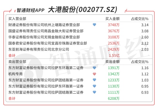 大港股份(002077.SZ):龙虎榜阵容豪华,机构席位与游资产生分歧,对倒净卖出188万元,买一是知名游资上塘路的席位买入3732万元,买三是知名游资苏南帮的席位买入3097万元,当日净买入1.33亿元,该股如突破前期高点,可看高一线。