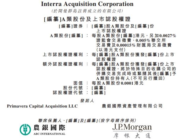 Interra Acquisition Corporation是一家新注册成立的特殊目的收购公司,旨在进行特殊目的收购公司的并购交易。公司的发起人为Primavera USLLC及农银国际资管。