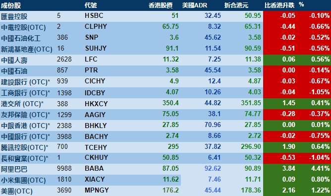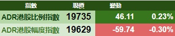 智通财经APP获悉,周二美股三大指数集体收跌,港股ADR指数上涨,按比例计算,收报19735点,较香港收市涨46.11点或0.23%。
