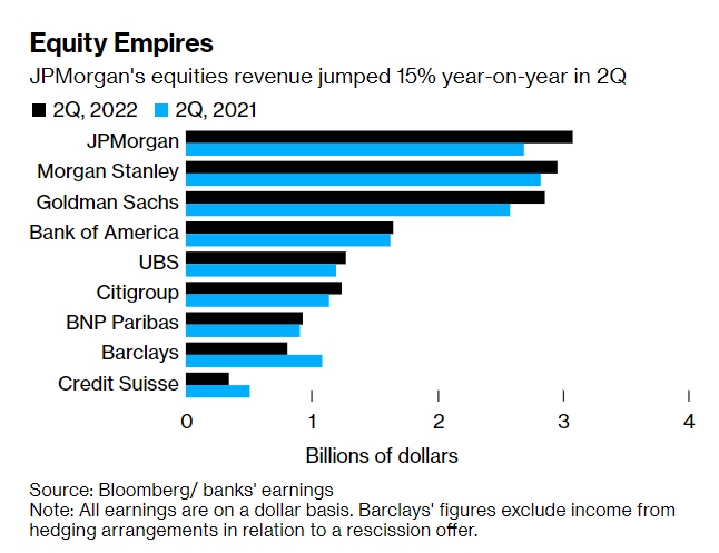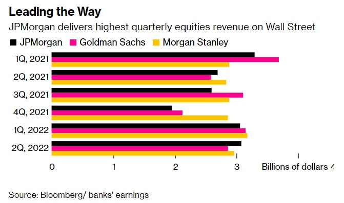智通财经APP获悉,4月至6月期间,摩根大通的证券交易业务营收达到近31亿美元,超过高盛(GS.US)和摩根士丹利(MS.US),这至少是在2006年以来的第一次。排在后面还有超越巴克莱的法国巴黎银行(BNP Paribas SA)。