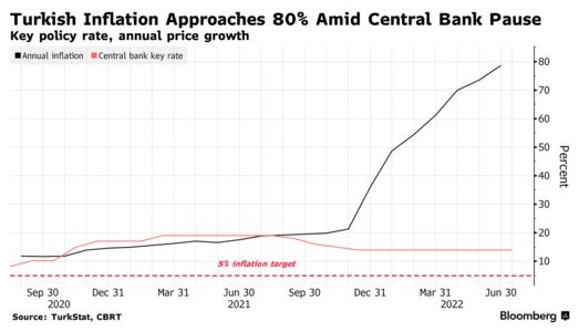 根据彭博社对22位分析师的调查,土耳其7月年通胀率预计将略高于80%,高于6月份的78.6%。此前数据显示,土耳其人口最多的城市伊斯坦布尔7月份房价同比增长超过99%。