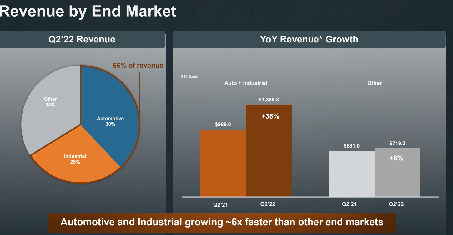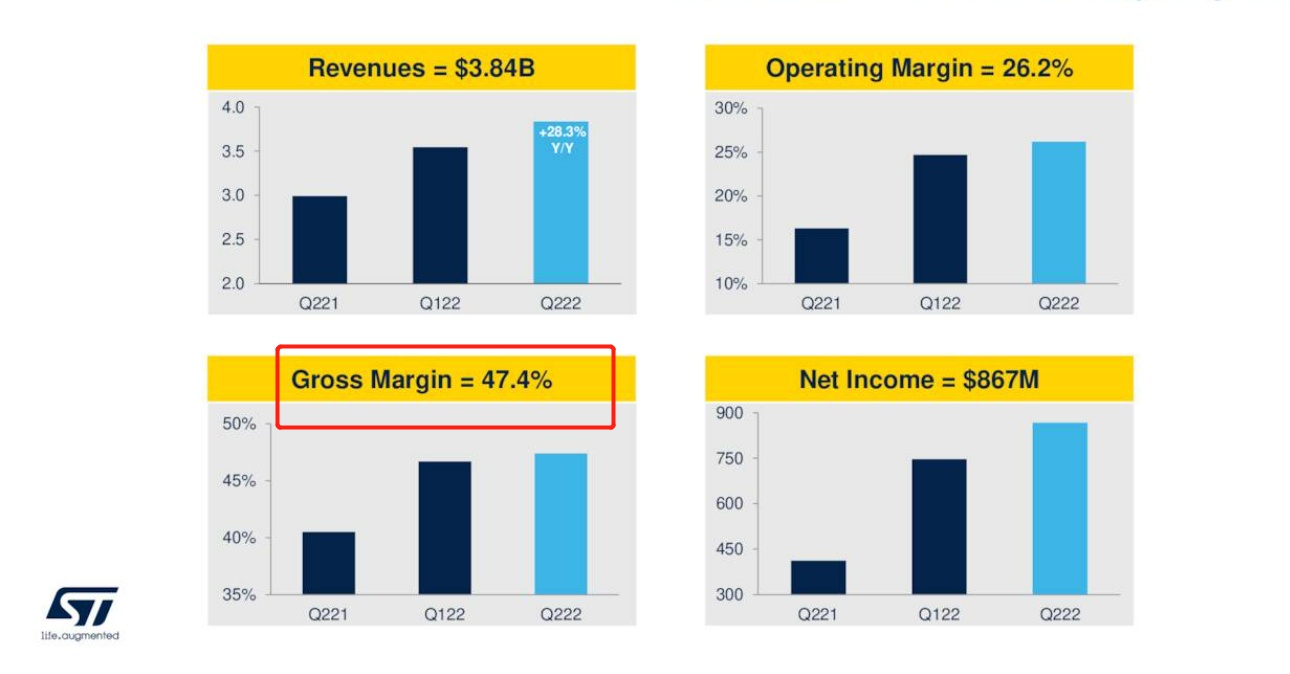 不同于CPU市场,MCU芯片市场可谓一派繁荣景象,MCU芯片巨头意法半导体(STM.US)和安森美半导体(ON.US)在电动汽车行业的强劲需求驱动之下,Q2业绩与未来业绩指引均大幅超市场预期,公布财报后股价一路飙升。其中意法半导体毛利率不断创新高,正向50%发起冲击,作为成本端压力较大的IDM大厂,其毛利率已超无晶圆厂AMD(Q2毛利为46%),远超IDM同行英特尔。而这一巨大差异反映出的正是芯片产业链细分领域截然不同的发展局势。
