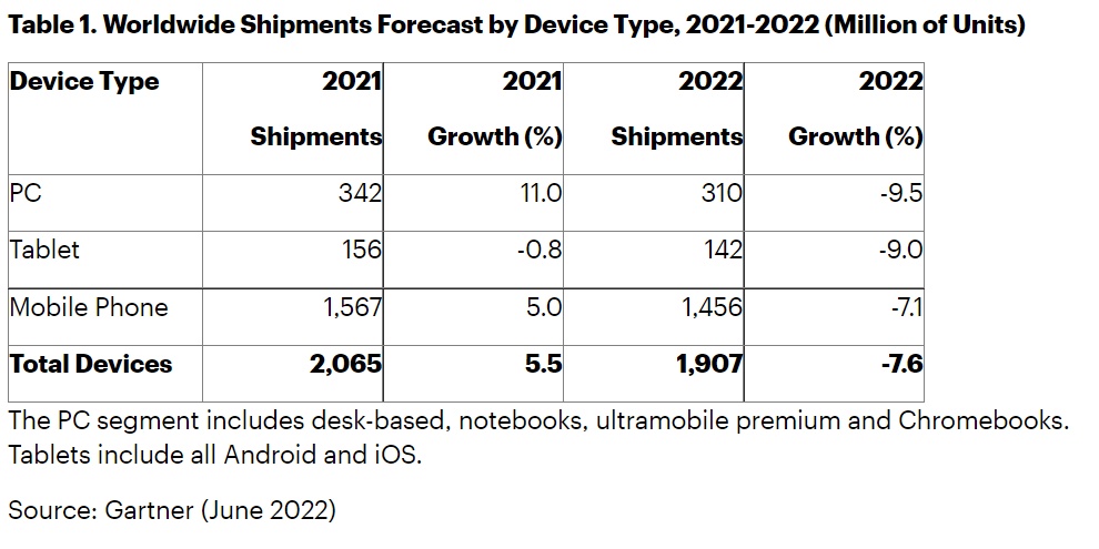 Gartner公布的最新2022年全球总设备出货量(PC、平板电脑和智能手机)预测数据则显示,2022 年全球PC出货量将下降 9.5%,平板电脑与智能手机出货量将分别下降9.0%和7.1%。