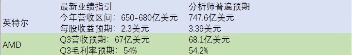 展望未来,英特尔将今年调整后营收指引大幅下调,远低于分析师预期747.6亿美元。英特尔同时将今年EPS预期3.6美元降至2.3美元,分析师预期为3.39美元。AMD预计Q3营收将约为67亿美元,分析师的平均预期为68.1亿美元,预计Q3调整后毛利率54%,也低于分析师预期。