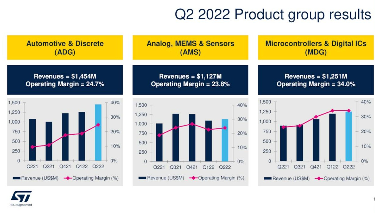 预期方面,意法半导体预计Q3净营收为42.4亿美元,高于38.1亿美元这一分析师普遍预期,环比增长10.5%;预计毛利率为47.0%,波动幅度为200个基点。同时意法半导体将2022年营收预测从148亿至153亿美元上调至159亿至162亿美元。