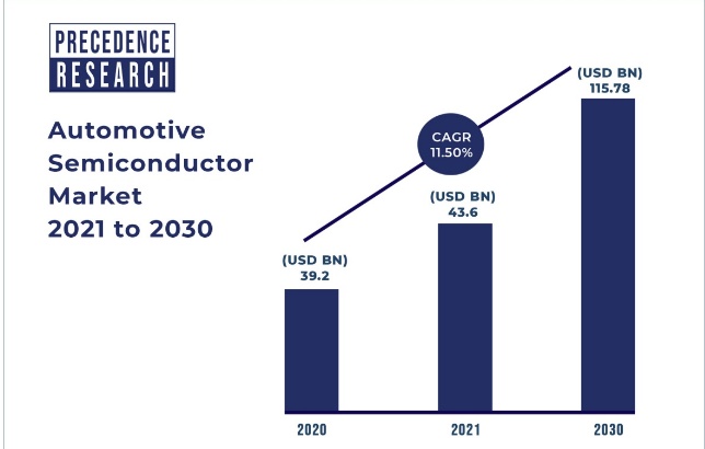 市场调研机构Precedence Research公布的最新预测数据显示,到2030年,全球汽车芯片市场规模预计将超过1157.8亿美元,并且从2022年到2030年,将以11.5%复合年增速扩大。