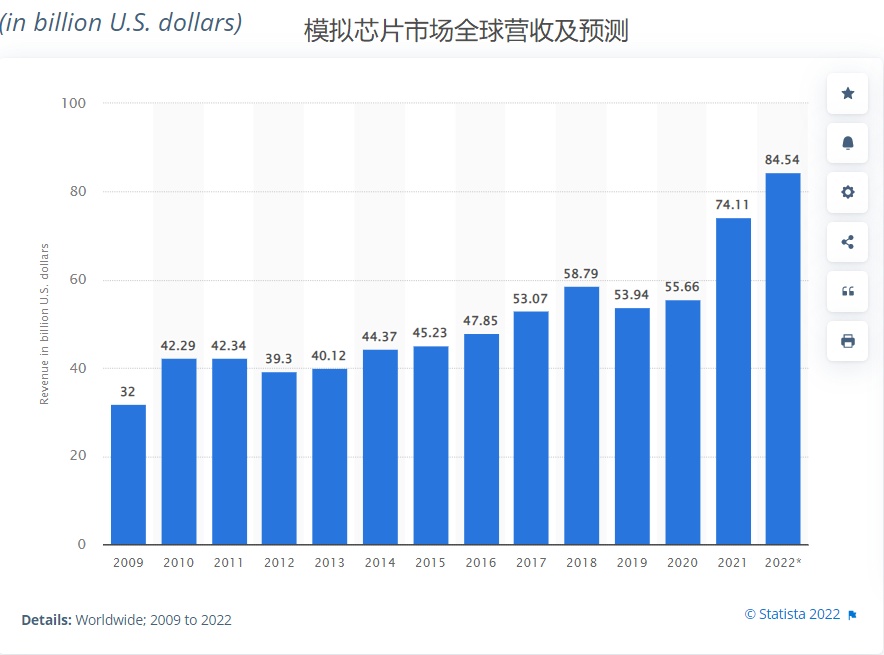市场对模拟芯片2022年市场营收预期同样较高,主要因该领域也将受益于电动汽车智能化趋势。另外,模拟芯片下游应用市场涵盖了几乎所有电子产品,从智能手机、笔记本电脑、LED ,到数控机床、医疗设备和电动汽车电子系统等。正是由于下游应用甚广,模拟芯片市场往往不会受单一产业景气变动影响,因此其价格波动没有存储芯片和逻辑电路等数字芯片的变化那么大。