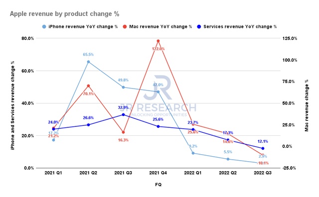 从业绩来看,苹果三季度收入增长了1.9%,而息税前利润同比下降了4.4%,市场在其发布财报之前对此已有了正确的判断,并且结果均好于预期。尽管如此,其关键部门的收入有明显的下降趋势。如上所示,服务部门在三季度收入增幅继续下滑,同比增长12.1%。iPhone和Mac的销售同样表现不佳,Mac收入同比下降10.1%。然而,消费放缓将不仅仅发生在三季度,疫情期间的快速增长已逐渐开始走向正常化。