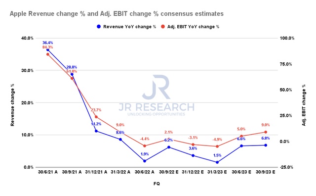 即使是看涨的分析师也认为,苹果的收入和息税前利润增长趋势可能会继续保持缓和至2023年,但这远远没有达到苹果在过去五到十年中公布的指标。