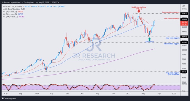 苹果非凡的执行力和供应链的弹性仍不足以证明其在未来四年的估值,预计苹果股价在其近期(166美元)和中期阻力(180美元)将面临巨大卖压,其潜在上行空间有限,投资者应谨慎在当前水平增加新的头寸。
