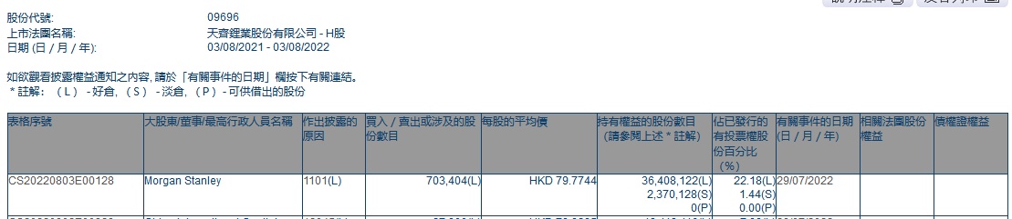 智通财经APP获悉,香港联交所最新资料显示,7月29日,Morgan Stanley增持天齐锂业(09696)70.3404万股,每股作价79.7744港元,总金额约为5611.36万港元。增持后最新持股数目约为3640.81万股,最新持股比例为22.18%。