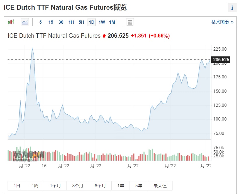 截至发稿,基准TTF荷兰天然气期货价格涨0.66%,至206.525欧元/兆瓦时。