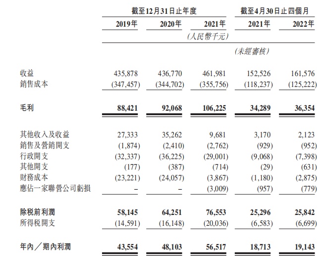 据招股书数据披露,2019年至2021年,该公司实现营收分别为4.36亿元、4.37亿元、4.62亿元,逐年增长;同期实现净利润分别为4355万元、4810万元、5652万元,亦不断增长。截至2022年4月30日,该公司继续保持增长之势,营收同比增长5.93%至1.62亿元,净利润同比增长2.23%至1914万元。