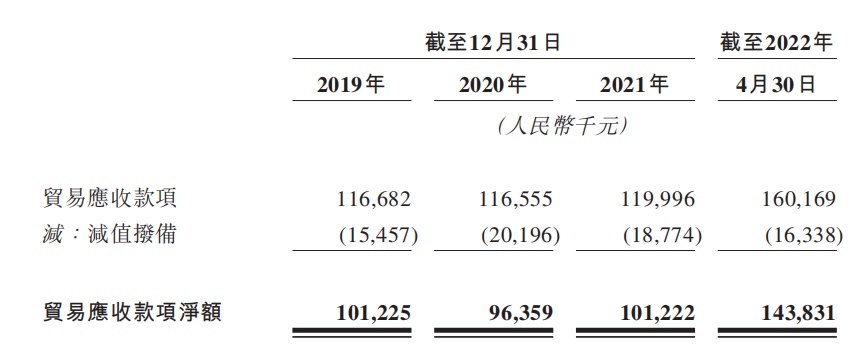 据招股书数据披露,2019年至2022年4月30日,苏新美好生活与与独立第三方的贸易应收款项(经计及减值拨备前)分别约为1.17亿元、1.17亿元、1.2亿元及1.60亿元。同期,该公司的贸易应收款项减值拨备分别为1550万元、2020万元、1880万元及1630万元,若扣除减值拨备,贸易应收款项净额分别为1.01亿元、0.96亿元、1.01亿元及1.44亿元。