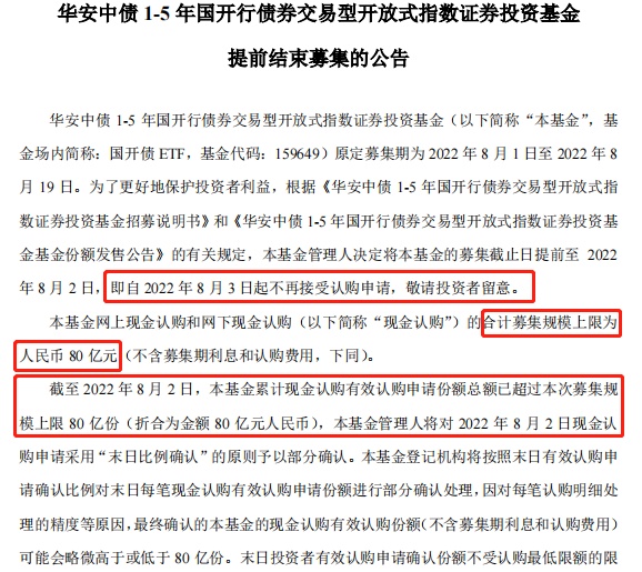 日前,华安基金发布《华安中债1-5年国开行债券ETF提前结束募集的公告》,公告显示,华安中债1-5年国开行债券ETF,原定募集期为8月 1日至8月19日。截至8月2日,该基金累计现金认购有效认购申请份额总额已超过本次募集规模上限80亿份(折合为金额80亿元人民币)。
