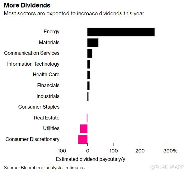 由于大宗商品价格飙升,预计能源股将在2022年引领股息增长。非必需消费品公司的股息预计将大幅缩减,该行业的部分公司今年稍早没有发放股息。