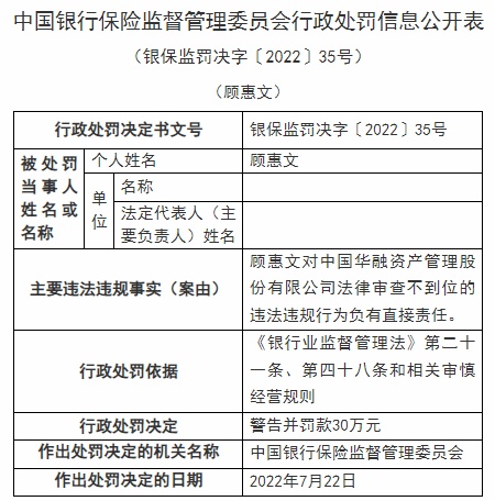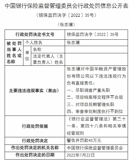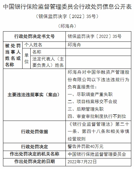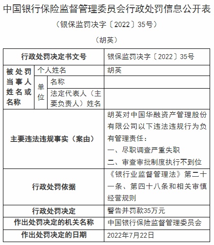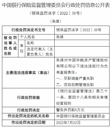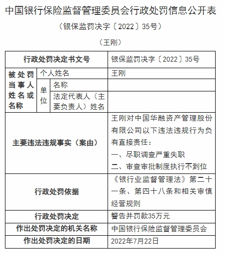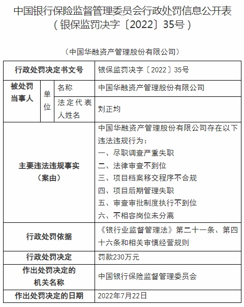 智通财经APP获悉,近日,中国华融资产管理股份有限公司被银保监会行政处罚,被罚230万元,作出处罚的决定日期为7月22日;6位员工共计被罚190万元,个人罚款为45万元至5万元不等。